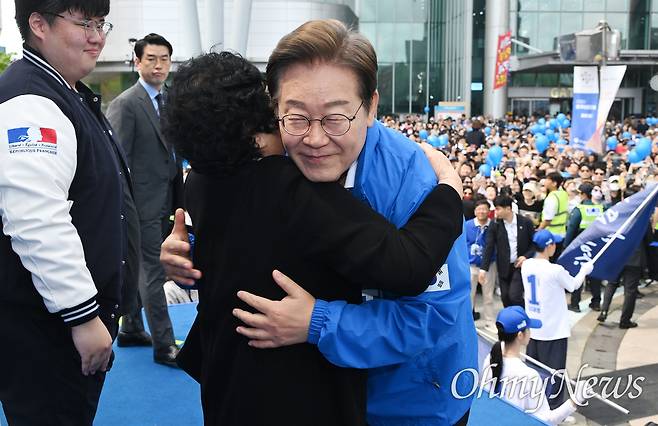 | ▲ 문재학 열사의 어머니 껴안은 이재명 후보 이재명 더불어민주당 대선 후보가 5.18 민주화운동 기념일을 하루 앞둔 17일 수많은 인파가 운집한 광주 서구 김대중컨벤션센터 광장에서 찬조연설을 한 고 문재학 열사의 어머니 김길자씨와 포옹하고 있다. |