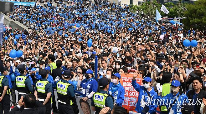 | ▲ 김대중컨벤션센터 광장 가득 메운 광주시민들 광주시민들이 17일 광주 서구 김대중컨벤션센터 광장에 운집해 이재명 더불어민주당 후보의 유세를 보고 있다. |