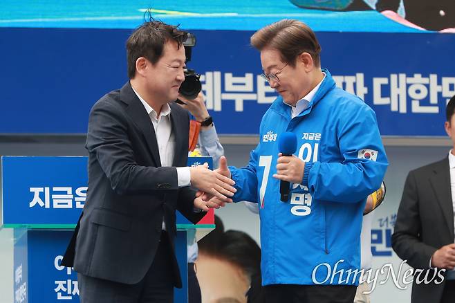 | ▲ 이재명 더불어민주당 대선 후보가 17일 오후 광주 서구 김대중컨벤션센터 광장에서 열린 선거유세에서 지지를 선언한 김용남 전 의원과 악수하고 있다. 국민의힘 출신으로 개혁신당 정책위의장을 지낸 김용남 전 의원은 이날 개혁신당을 탈당하고 이재명 후보 지지를 선언했다. |