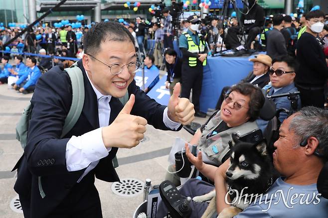 | ▲ 광주 시민들 만난 김상욱 의원 국민의힘을 탈당하고 이재명 더불어민주당 대선 후보 지지를 선언한 김상욱 무소속 의원이 17일 오후 광주 서구 김대중컨벤션센터 광장에서 열린 이 후보 선거유세에 참석해 시민들과 인사를 나누고 있다. |