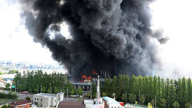 광주공장은 서쪽 공장(2공장)과 남쪽 공장(1공장) 등 2개 구획으로 구분되는데, 이날 오후 5시 기준 축구장 5개 규모인 서쪽 공장의 70% 이상이 불에 탔으며 나머지 부분으로도 불이 번지고 있습니다.