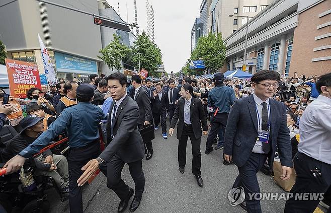 (광주=연합뉴스) 황광모 기자 = 더불어민주당 이재명 대선후보가 17일 광주광역시 동구 금남로에서 열린 5·18 광주민주화운동 45주기 전야제에 입장하며 시민들과 인사하고 있다. 2025.5.17