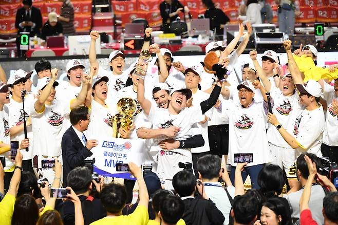 <사진> 1997년 농구단 창단 후 처음으로 우승을 차지한 LG 선수단이 환호하고 있다. KBL 제공