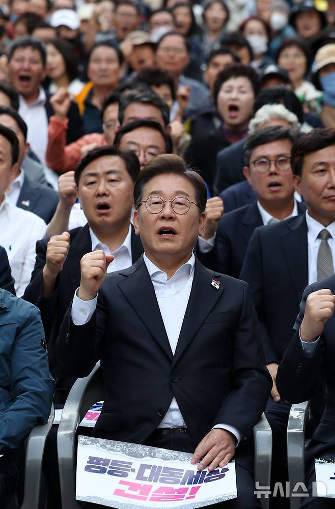 임을 위한 행진곡 제창하는 이재명 후보