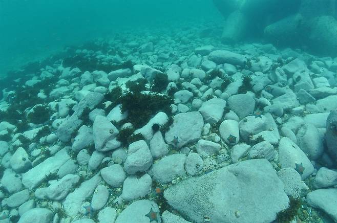| ▲ 바다사막화 하얗게 변한 암반에 성게와 불가사리 등, 조식동물만이 자라고 있다 |