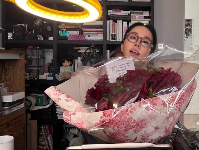 사진에서 엄정화는 지인에게 받은 대형 꽃다발을 한 아름 품에 안고 밝은 표정을 짓고 있다.