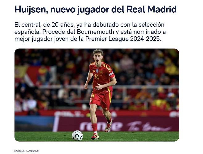 스페인 '카데나세르'는 "후이센의 레알 마드리드 이적이 확정됐다. 스페인 국가대표로 활약하고 있는 센터백은 프리미어리그의 제안을 거부하고 레알 마드리드 유니폼을 입고 국제축구연맹(FIFA) 클럽월드컵에 참가하기를 바라고 있다"고 보도했다.