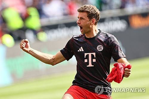 epa12109841 Thomas Mueller of Munich celebrates with supporters after winning the German Bundesliga soccer match between TSG Hoffenheim and FC Bayern Munich, in Sinsheim, Germany, 17 May 2025. EPA/ANNA SZILAGYI CONDITIONS - ATTENTION: The DFL regulations prohibit any use of photographs as image sequences and/or quasi-video.