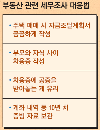 계좌 내역 등 자금 사용처에 대한 증빙도 철저히 갖춰놔야 한다. 부동산과 관련한 세무당국의 자금 출처 조사는 이르면 2~3년, 늦으면 5~6년이 지나 나오는 경우가 많다. 자금을 사용하고 몇 년이 지난 뒤에 증빙 서류를 확보하기란 여간 어려운 일이 아니기 때문에 미리 준비를 해놓는 것이 좋다. A세무사는 “주택 매매나 전세 계약 이후 10년 정도는 증빙 자료를 보관하는 것이 좋다”며 “부모와 자식 등 관련자 모두 서류를 준비해야 한다는 사실을 유념해야 한다”고 말했다.