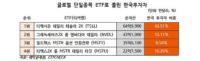 특히 세계 최대 단일종목 ETF인 '디렉시온 데일리 테슬라 2X'의 한국인 투자 비중은 42%를 넘습니다.