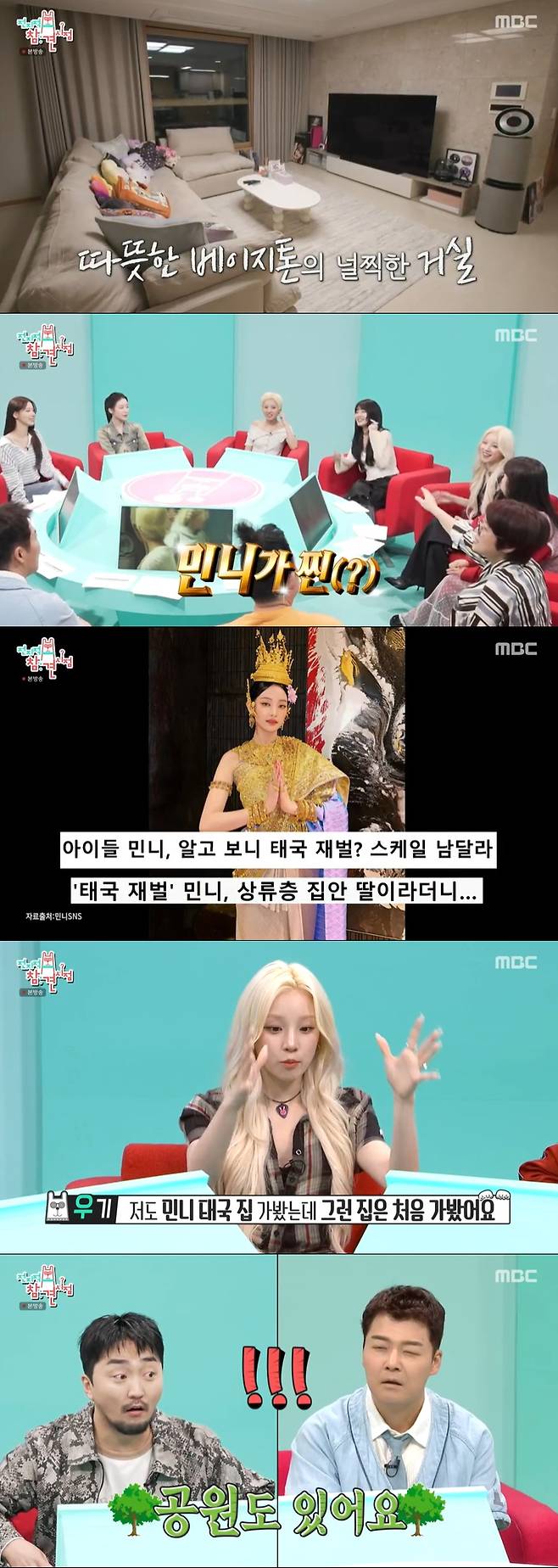 이에 태국 부자인 민니에 관해 이야기를 이어가다 우기는 "(민니의) 태국 집을 가봤는데 그런 집을 처음 봤다. 집이 몇 채가 있다"라고 말하자, 민니는 "집이 3채다"라고 말해 놀라움을 자아냈다.