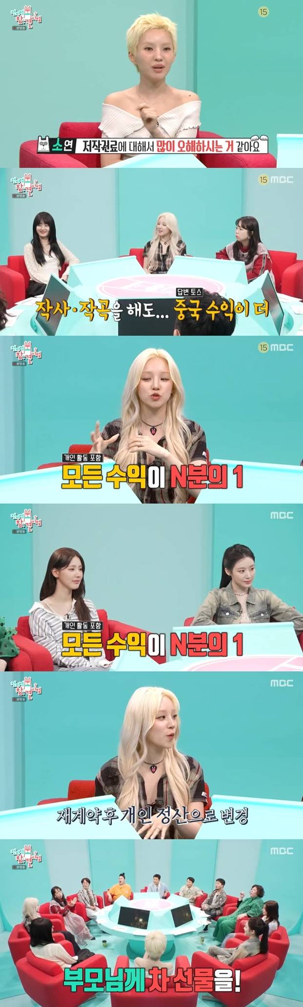 이에 전소연은 "저작권료에 관해 많이 오해하시는데, 저작권료는 솔직히 적다. 작사 작곡을 해도 중국 수익이 더 많습니다"라며 우기를 가리켰다.