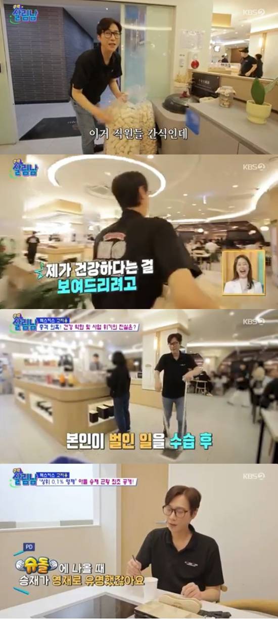 고지용은 직원들의 간식인 대용량 뻥튀기를 안으로 옮기면서 "제가 이것까지는 안 하는데 제가 건강하다는 걸 보여드리려고"라고 말해 웃음을 자아냈다.