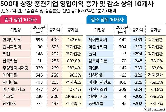 중견기업 중 한미반도체(409억원·142.6%)가 영업이익이 가장 크게 증가했다. 반면 제이앤티씨(-459억원·적자전환)는 1분기 영업이익이 가장 크게 줄었다.