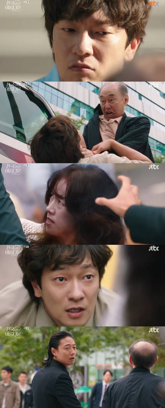 17일 방송된 JTBC 토일드라마 '천국보다 아름다운' 9회에서는 솜이(한지민 분)가 강정구(정진각)에게 위협을 당하는 고낙준(손석구)을 지킨 모습이 그려졌다.