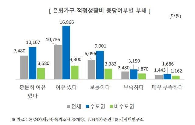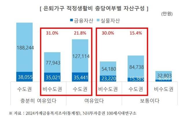 흥미로운 점은 수도권 은퇴가구는 비수도권보다 더 많은 순자산을 보유하고도 적정 생활비에 여유를 느끼는 정도가 현격히 낮았습니다. 수도권보다 비수도권에서 순자산 대비 금융자산 비중이 높았던 탓으로, 순자산이 높아도 적정 금융자산이 확보되지 않으면 생활비 조달에 압박을 느끼는 것으로 파악됐습니다.