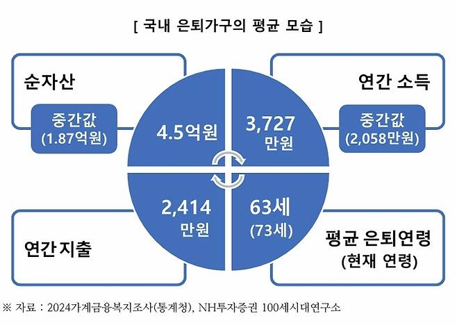 우리나라 은퇴가구는 평균 63세에 은퇴해 현재 73세에 이르렀습니다. 이는 NH투자증권 100세시대연구소가 통계청 ‘2024 가계금융복지조사’를 기반으로 은퇴가구 4076건을 분석한 것입니다.