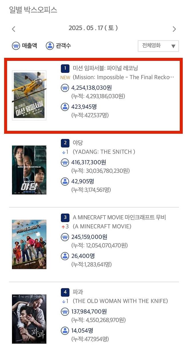 18일 영화관입장권 통합전산망에 따르면, 전날 '미션 임파서블: 파이널 레코닝'(이하 '미션임파서블 8')은 423,945명의 관객을 동원하며 압도적 박스오피스 1위에 올랐다.