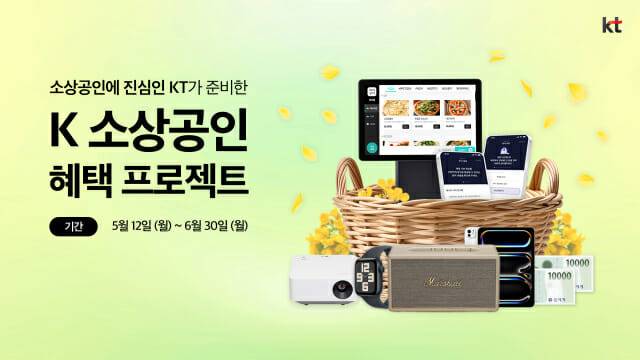 (지디넷코리아=최이담 기자)KT는 소상공인을 위해 ‘K소상공인 혜택 프로젝트’를 6월 30일까지 진행한다고 18일 밝혔다. 이 프로젝트는 KT의 소상공인 서비스 가입 고객에게 각종 경품과 혜택을 제공하는 행사다. 소상공인의 매장 운영 고민을 덜고, 디지털 기술로 효율적인 사업 운영을 지원하고자 이번 행사를 기획했다.