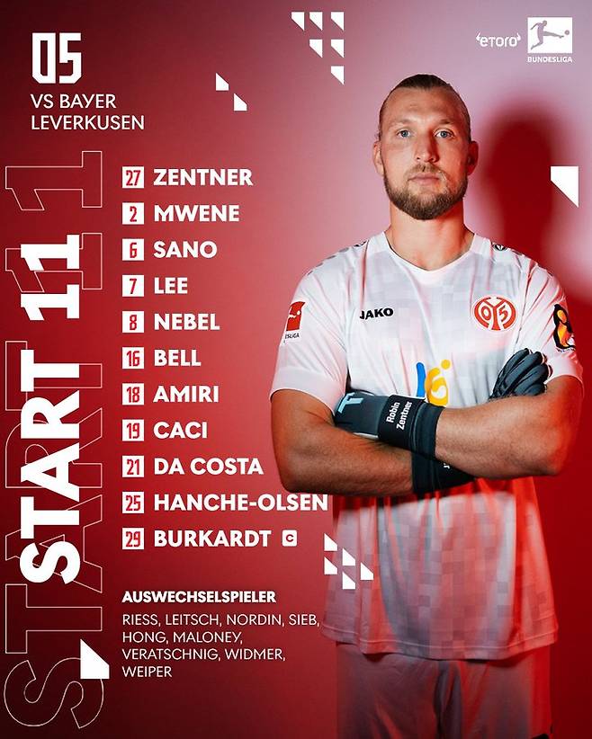 보 헨릭센 감독이 이끄는 홈팀 마인츠는 3-4-2-1 포메이션을 가동했다. 로빈 젠트너가 골문을 지켰고, 백3는 안드레아스 한체-올센, 스테판 벨, 대니 다 코스타로 구성됐다. 미드필더 라인에는 필리프 음웨네, 나딤 아미리, 사노 카이슈, 앙토니 카시가 포진했고, 2선 공격진에는 이재성과 파울 네벨이 배치됐다. 최전방에는 요나탄 부르카르트가 출전했다. 홍현석은 벤치에서 경기를 시작했다.