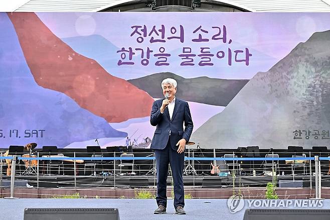 (정선=연합뉴스) 지난 17일 서울 여의도 한강공원 물빛무대 일원에서 정선아리랑 50주년을 기념해 '정선아리랑 in Seoul' 행사가 열려 최승준 정선군수가 인사말을 하고 있다. 2025.5.18 [정선군 제공. 재판매 및 DB 금지]