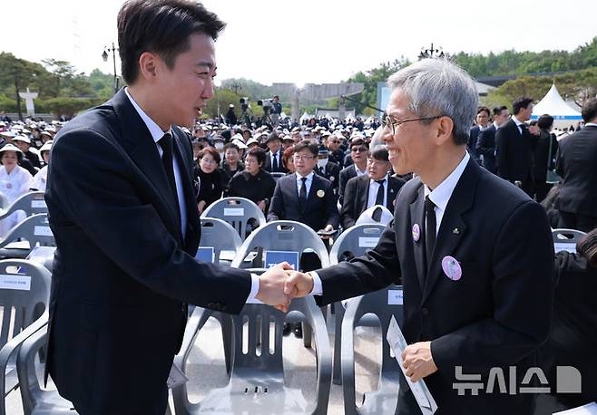 [광주=뉴시스] 고범준 기자 = 이준석 개혁신당 대선후보와 권영국 민주노동당 대선 후보가 18일 광주 북구 국립5·18민주묘지에서 열린 제45주년 5·18민주화운동 기념식에서 악수하고 있다. (대통령실통신사진기자단) 2025.05.18. bjko@newsis.com