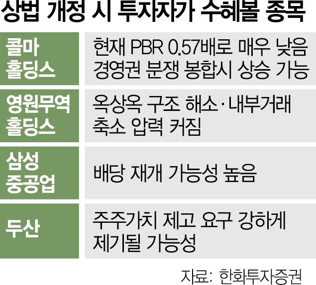 이 외에도 한화오션(042660), 태광산업(003240), 사조산업, 금호석유화학, 두산에너빌리티 등이 상법 개정을 계기로 주목할 종목 명단에 올랐다.