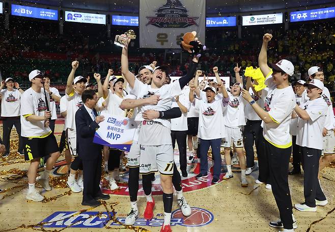 | ▲ 17일 서울 잠실학생체육관에서 열린 2024∼2025시즌 프로농구 서울 SK 나이츠와 창원 LG 세이커스의 챔피언결정전 7차전 경기에서 승리한 LG 선수들이 이날 경기에서 MVP를 차지한 허일영 선수와 환호하고 있다. |