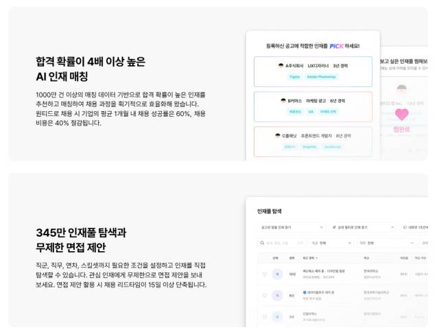 원티드랩은 1000만 건 이상의 실제 합격 및 매칭 데이터를 기반으로 자체 AI 모델을 구축했다. 이를 통해 기업과 구직자 간 더욱 정밀한 매칭을 지원한다. 자사 AI 모델 기반의 매칭 서비스를 활용한 기업은 채용 소요 시간을 70%까지 단축할 수 있어 효율적인 인재 채용이 가능하다. AI 기반 인재 탐색 서비스인 '공고로 인재 찾기’ 역시 기업 인사 담당자들의 호평을 받고 있다. 채용 공고를 기반으로 맞춤형 인재를 추천해 인사 담당자가 필터를 사용해 수작업으로 후보자를 추리는 수고를 덜어준다.