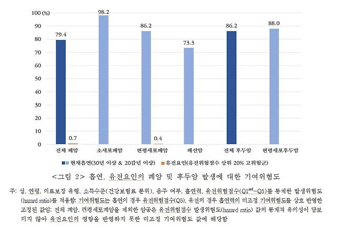 이외에도 폐암, 후두암 발생 기여위험도(특정 위험요인에 대한 노출군 집단의 질병발생률 중 위험요인이 기여하는 정도) 분석에서는 '30년 이상, 20갑년 이상' 흡연자인 경우 소세포폐암 발생에 흡연이 기여하는 정도가 98.2%로 대부분을 차지하며, 유전요인의 영향은 유의미하지 않았다. 그 외 편평세포후두암은 88.0%, 편평세포폐암은 86.2%가 흡연이 암 발생에 기여하는 것으로 나타났다.