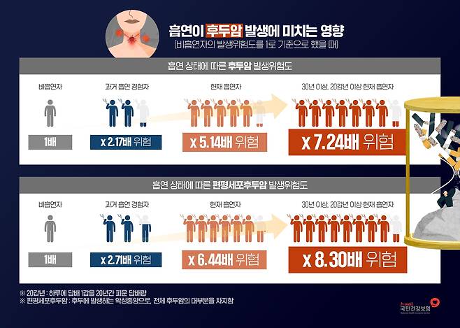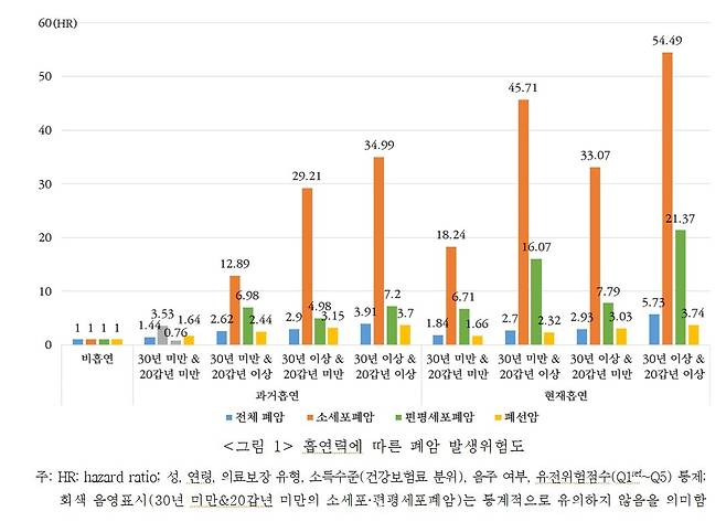 또한 연구대상자의 일반적 특성(성, 연령, 의료보장 유형, 소득수준(건강보험료 분위), 음주 여부를 포함함)을 비롯해 폐암 및 후두암의 유전위험점수가 동일 수준이더라도 '30년 이상, 20갑년 이상' 흡연자인 경우 비흡연자에 비해 소세포폐암은 54.49배, 편평세포폐암은 21.37배, 편평세포후두암은 8.30배 발생위험이 유의하게 높은 것으로 파악됐다.