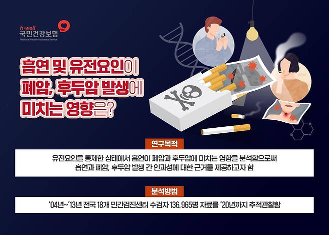 연구원과 연세대 공동 연구팀은 2004~2013년 전국 18개 민간검진센터 수검자 13만6965명을 대상으로 건강검진 및 유전위험점수(PRS, polygenic risk score) 자료, 중앙암등록자료, 건강보험 자격자료를 연계하여 2020년까지 추적 관찰, 분석했다. 분석대상 암종은 폐암(전체, 소세포폐암, 편평세포폐암, 폐선암), 후두암(전체, 편평세포후두암)이다.