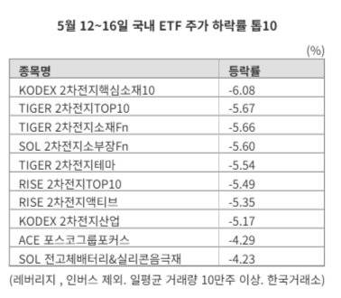 반면 이차전지 ETF는 반등장 속에서도 유난히 약세를 면치 못했다. 'KODEX 2차전지핵심소재10'가 -6.08%로 가장 큰 낙폭을 기록했다. 뒤이어 'TIGER 2차전지TOP10'(-5.67%), 'TIGER 2차전지소재Fn'(-5.66%), 'SOL 2차전지소부장Fn'(-5.60%), 'TIGER 2차전지테마'(-5.54%), 'RISE 2차전지TOP10'(-5.49%), 'RISE 2차전지액티브'(-5.35%), 'KODEX 2차전지산업'(-5.17%), 'ACE 포스코그룹포커스'(-4.29%), 'SOL 전고체배터리&실리콘음극재'(-4.23%) 등 이차전지 테마 ETF가 줄줄이 하락했다.