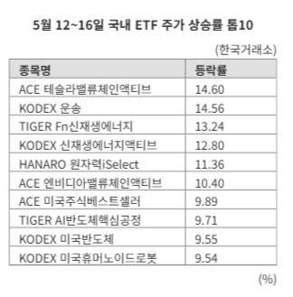 18일 한국거래소에 따르면 지난 12~16일 국내 ETF 시장에서 가장 높은 상승률을 기록한 상품은 'ACE 테슬라벨류체인액티브'로 이 기간 14.60% 상승했다. 레버리지, 인버스 종목과 일평균 거래량 10만주 이하 종목은 조사 대상에서 제외한 기준이다.