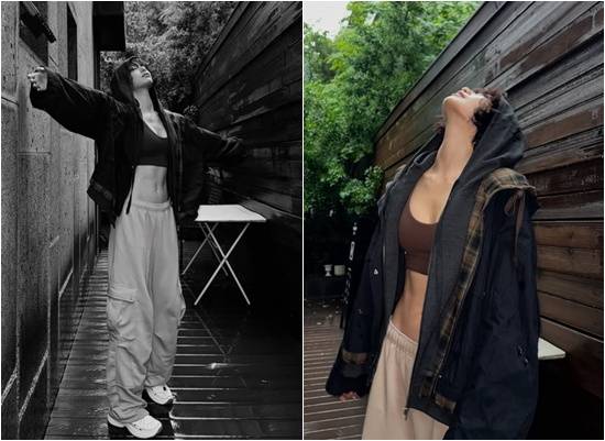 브라톱에 후드집업을 걸친 편안한 패션을 입고 있는 나나는 선명하게 갈라진 복근을 자랑해 눈길을 끌었다.