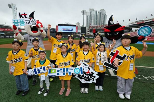 행사에 참가한 KT꿈품교실 아동들은 수원 KT위즈파크 내 연습실에서 공 던지기와 배팅 체험을 하고 기자실과 전력분석실 등 야구장 투어를 통해 평소에 쉽게 접할 수 없는 시설들을 둘러봤다.