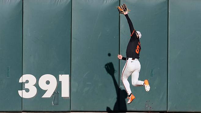 ▲ 샌프란시스코 이정후가 18일(한국시간) 미국 캘리포니아주 샌프란시스코 오라클 파크에서 열린 애슬레틱스와 홈 경기, 1회초 브렌트 루커의 타구를 잡아내고 있다.