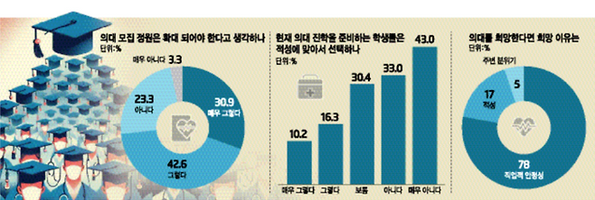 이와 함께 의대 진학을 준비하는 학생 가운데, 적성에 따른 선택이냐는 질문에 43.0%(아니다 33.0%, 매우 아니다 10.0%)가 '그렇지 않다'고 대답했다. 적성에 맞아서 선택했다는 의견은 26.5%(매우 그렇다 10.2%, 그렇다 16.3%), 보통 30.4%였다.