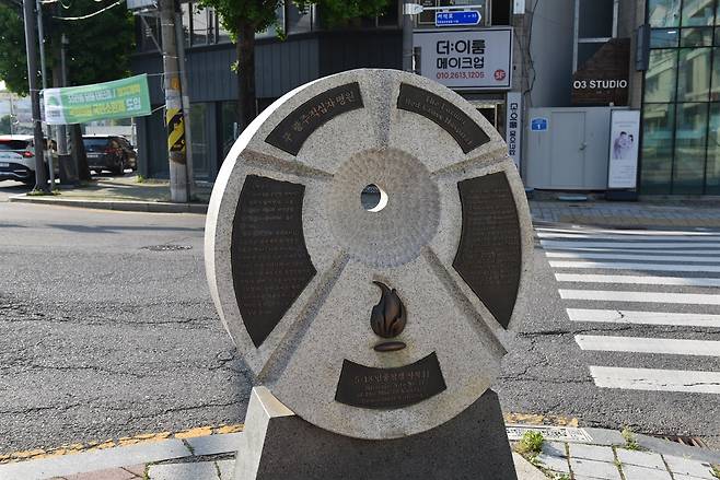 | ▲ 518사적지 11호 - 맞은 편에 보이는 교통표지판과 달리는 자동차들을 보면서 과거와 현재를 공존하는 우리를 떠올려 보았다. |