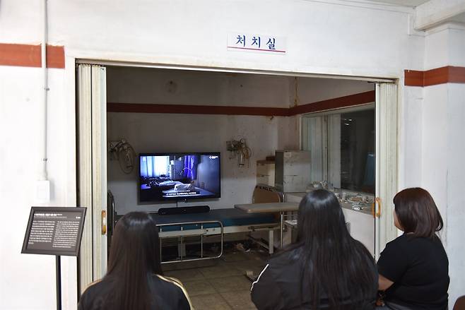 | ▲ 응급실 안에 있는 '처치실' 이곳에서 영상 전시물을 시청하고 있는 학생들. |