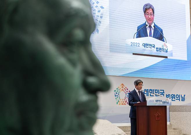 | ▲ 2022년 9월 13일 당시 김명수 대법원장이 서울 서초구 서초동 대법원에서 열린 2022 법원의 날 기념식에서 초대 대법원장인 가인 김병로 선생 동상 앞에서 기념사를 하고 있는 모습. |