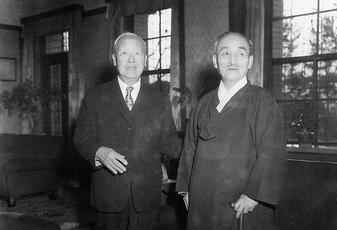 | ▲ 1957년 12월 16일, 당시 퇴임한 김병로 전 대법원장이 경무대를 방문, 이승만 대통령과 자리를 함께했다. |