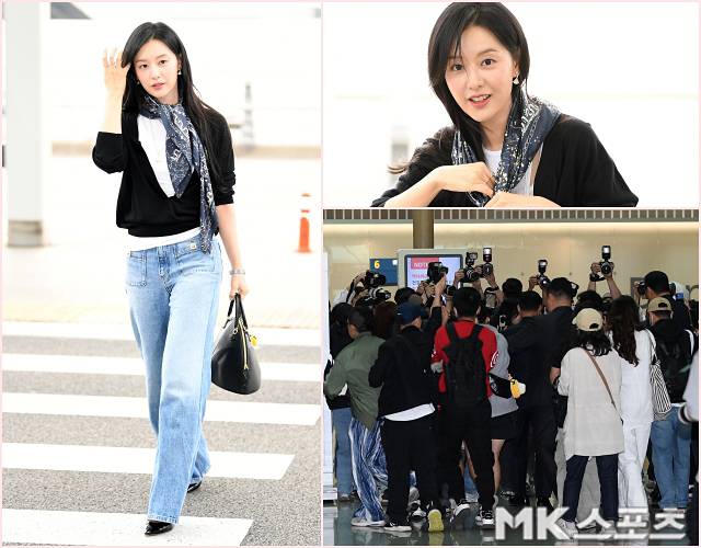출국길에 오른 김지원은 화이트 티셔츠에 연한 컬러의 청바지, 블랙 가디건을 걸치고 스카프로 포인트를 더한 감각적인 공항 패션을 선보였다.