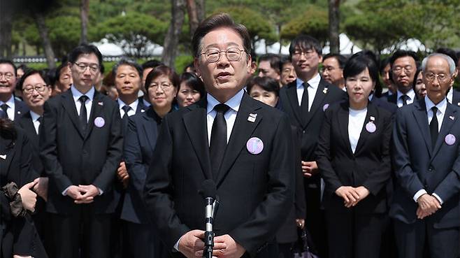 ▲ 더불어민주당 이재명 대선후보가 18일 광주광역시 북구 국립 5·18민주묘지에서 열린 5·18민주화운동 45주년 기념식에 참석한 뒤 취재진과 만나 인터뷰 하고 있다.