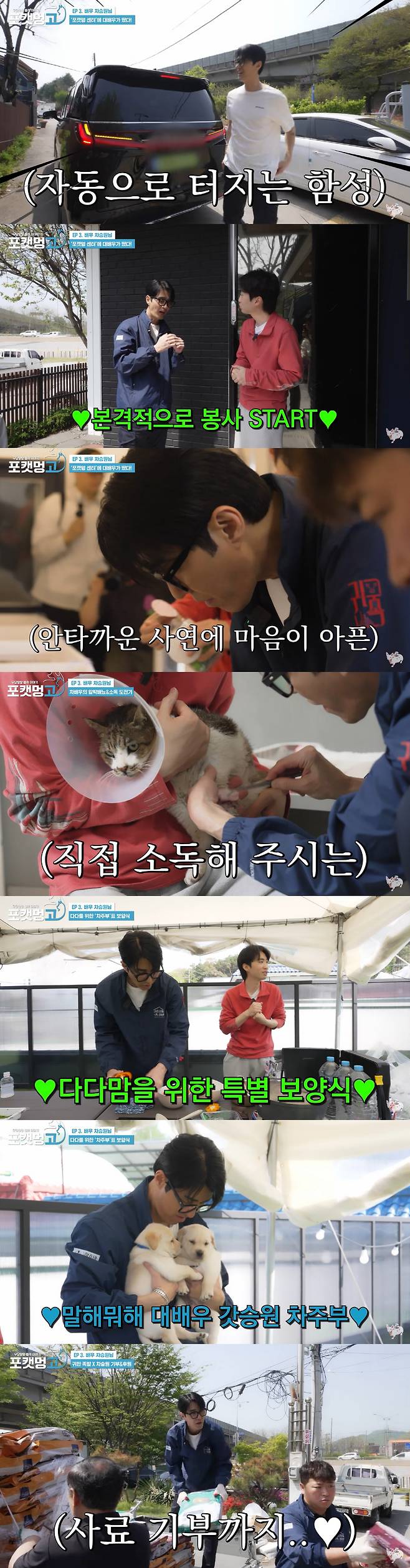 차승원은 산불 피해견, 개식용 농장에서 구조된 유기견, 천안 길고양이 학대 피해묘 등 하나하나 정성스럽게 살폈고, 특히 학대당한 고양이의 상처를 직접 소독하며 깊은 관심을 드러냈다.