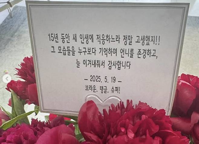 17일 엄정화는 "벌써 15년 전. 갑상선 수술 이후 힘든 후유증과 떨리는 목소리와 함께한 시간들 속에서 조용히, 묵묵히 나를 지켜준 사람들. 내 사랑하는 브라운, 탱글이. 슈퍼 ,가족들 친구들... 참 고맙고 사랑해. 꽃 고마워 재희야. 탱글아 보고싶어"라 했다.