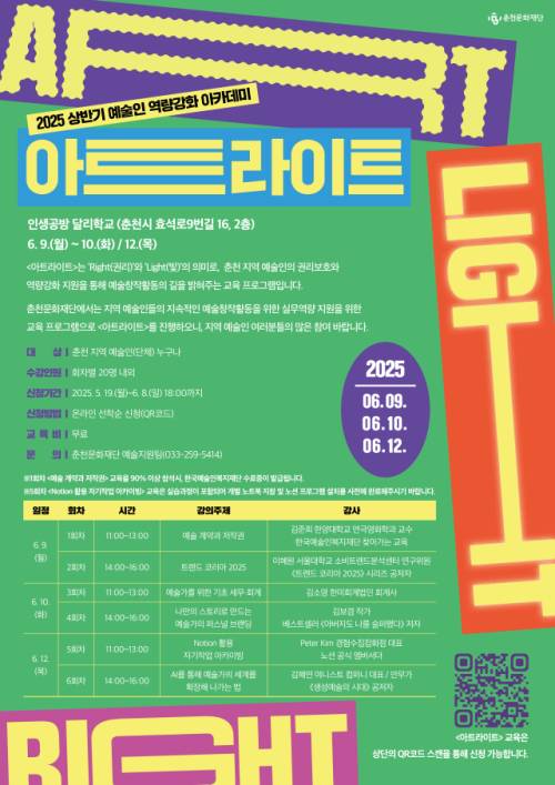 춘천문화재단이 2025 예술인 역량강화 아카데미 ‘아트라이트’ 참여자를 다음달 8일까지 모집한다.