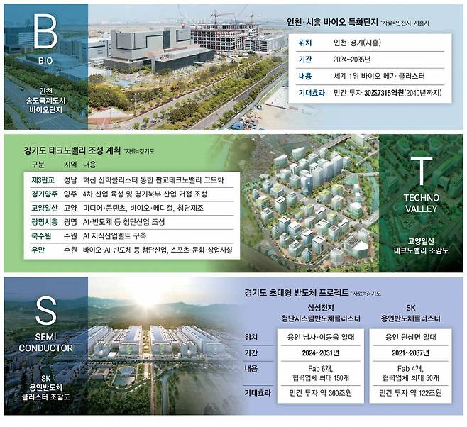 우선 성남시 금토동 일대에 연면적 52만8000㎡(약 16만평)의 제3판교테크노밸리가 2029년까지 조성된다. 광명시흥테크노밸리는 AI·반도체 중심 일자리와 주거·상업·문화 공간이 어우러진 미래형 자족복합도시로 조성된다. 경기도 수부도시인 수원에는 장안동 일대에 '경기 북수원 테크노밸리', 우만동 일대에 '우만 테크노밸리'를 만든다. 양주테크노밸리와 고양일산테크노밸리는 상대적으로 열악한 북부지역의 산업 생태계를 활성화하는 마중물로 기대를 모은다.