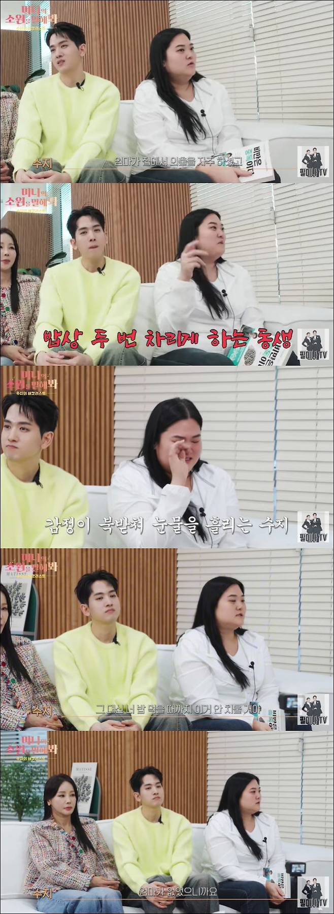 이에 전문의가 "엄마의 빈자리를 채우는 엄마의 역할을 했던 것"이라 정리하자 수지 씨는 울컥한 듯 눈물을 보였다. 전문의는 "그때 왜 그렇게 열심히 요리를 했냐"고 물었고 수지 씨는 "필립이가 좋아했다. 제가 만들어주는 걸 잘 먹고 만들어줄 때 좋아하니까 제가 더 열심히 했던 거 같다. 4시간, 5시간 동안 컴퓨터만 보고 있으니까 불쌍하더라. '너 밥 먹고 싶을 때 와서 밥 먹어라. 대신 너 밥 먹을 때까지 이거 안 치울 거야' (했다)"라고 떠올렸다.