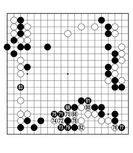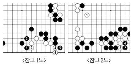 백이 살기 위해 두고 싶지 않은 수를 많이 뒀다. 78로 몰고 80에 둔 걸로 모자라 82로 막아 뒷손을 잡았다. 그사이 흑 세력은 강해졌다. 힘을 몰아 83으로 뛰어들었다. 저 앞으로 돌아가 <참고 1도> 흑1 때 백2로 얼른 살아 두느니 못했다. <참고 2도>라면 백이 잡힌다.